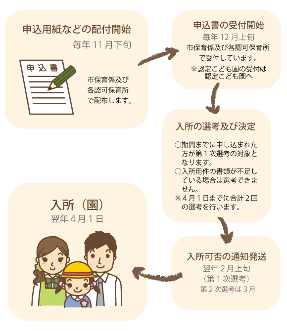 保育所の入所受付は、おもに12月上旬から開始されます。入所希望の方は所定の申込用紙に記入し、市役所こども育成課か各認可保育所に提出してください。(特別支援保育、広域利用、産休・育休明けの申込みは市役所こども育成課のみで受け付けています。)